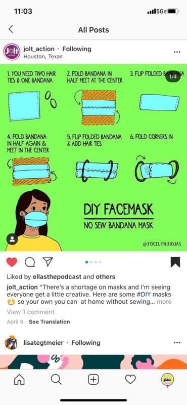 Jolt Action is a non profit based in Texas that typically responds to immigration related issues, in the art work we see a digital step by step description of how to make a no sew mask. The work prioritizes utility over artistry, I see this as a common theme through the non profit organization posts.