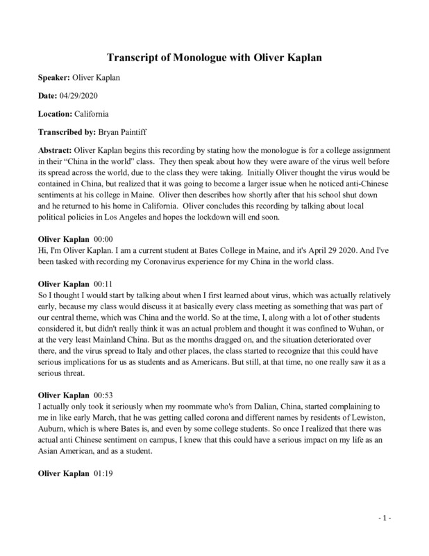 Oliver Kaplan begins this recording by stating how the monologue is for a college assignment in their “China in the world” class. They then speak about how they were aware of the virus well before its spread across the world, due to the class they were taking. Initially Oliver thought the virus would be contained in China, but realized that it was going to become a larger issue when he noticed anti-Chinese sentiments at his college in Maine. Oliver then describes how shortly after that his school shut down and he returned to his home in California. Oliver concludes this recording by talking about local political policies in Los Angeles and hopes the lockdown will end soon.