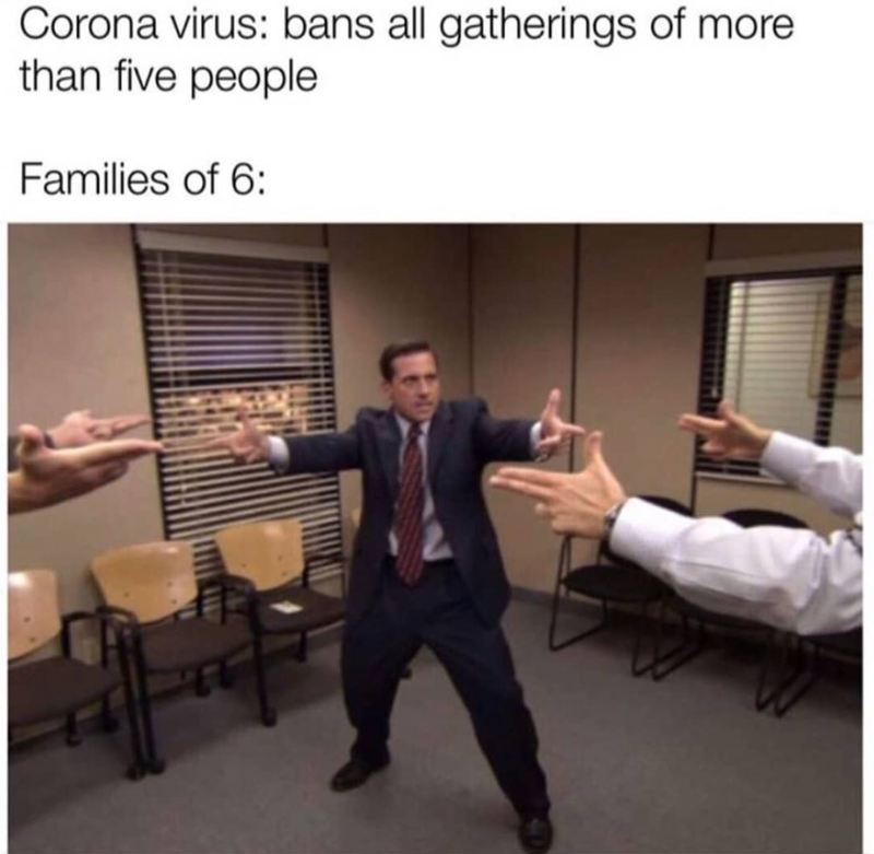 This meme connects to a very funny scene in the show 'The Office'. This meme is poking fun at the executive order that mandates groups of 5 people as the maximum number of people that can be together. Making a joke out of this order might illustrate the lack of severity Americans are viewing the pandemic with. #VART3030