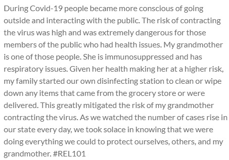 During Covid-19 people became more conscious of going outside and interacting with the public. The risk of contracting the virus was high and was extremely dangerous for those members of the public who had health issues. My grandmother is one of those people. She is immunosuppressed and has respiratory issues. Given her health making her at a higher risk, my family started our own disinfecting station to clean or wipe down any items that came from the grocery store or were delivered. This greatly mitigated the risk of my grandmother contracting the virus. As we watched the number of cases rise in our state every day, we took solace in knowing that we were doing everything we could to protect ourselves, others, and my grandmother. #REL101