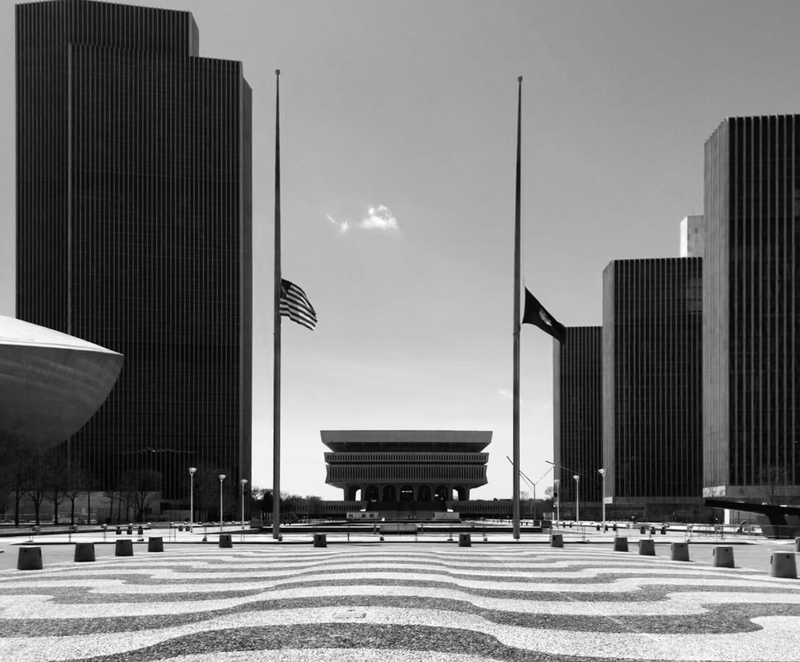 The U.S. and New York State flags flying at half-mast in at the Empire State Plaza in Downtown Albany, NY in late April, after Governor Andrew Cuomo ordered all flags to be flown at half-mast in honor of all who have died from COVID-19. The New York State Museum is seen straight ahead centered between the two flags.