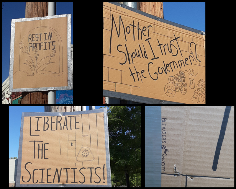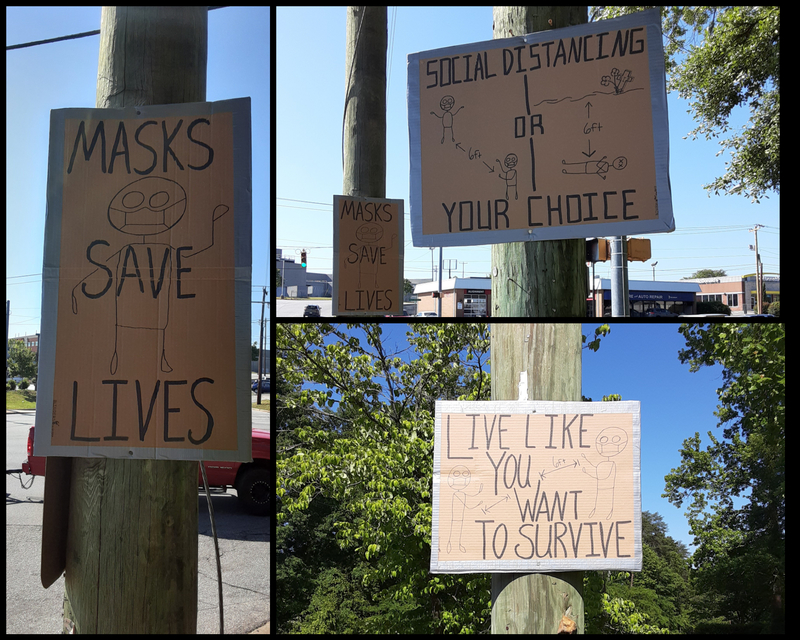 A selection of images from around the Greenville SC area all by the street artist BLINDERS. They address Coronavirus awareness, public safety, masks wearing, social distancing and government distrust. All posters are signed BLINDERS 5/20 YOTP (Year Of The Plague)