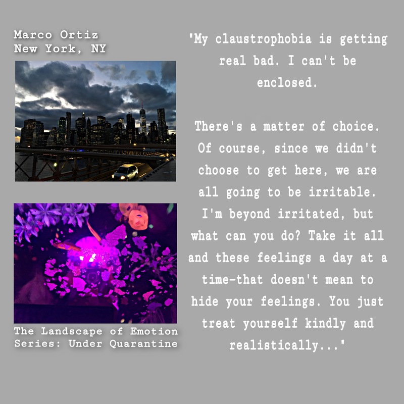 The Landscape of Emotion Series: Under Quarantine is a series illustrating the diverse experiences of mental health and feelings throughout quarantine.Marco Ortiz, my nephew expresses the physical fear, and argues that we must accept certain feelings during these troubling times.
