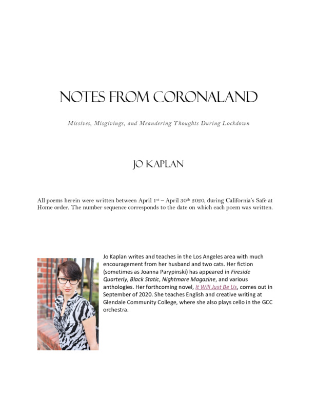 My English professor, Jo Kaplan, pen name for Joanna Parypinski, wrote a lovely collection of poetry while in quarantine in April 2020. The poems are beautiful in their simplicity and accessibility. The language is sometimes surprising, but always profound and universal. I think they have captured the feelings of all of us during this difficult time.