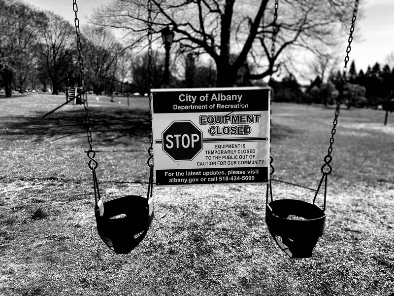 Taken at Washington Park in Albany, NY in late April. The sign notes that these swings are closed and cannot be used due to COVID-19. All other playgrounds and equipment in the park were closed and had similar signage.