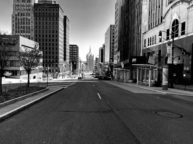 Down an empty State Street in Downtown Albany, NY in late April. This photo was taken standing in the middle of the street, which normally would not be possible as this street is usually busy and packed with cars. The SUNY Central Administration building is seen straight ahead in the distance.