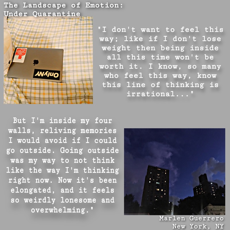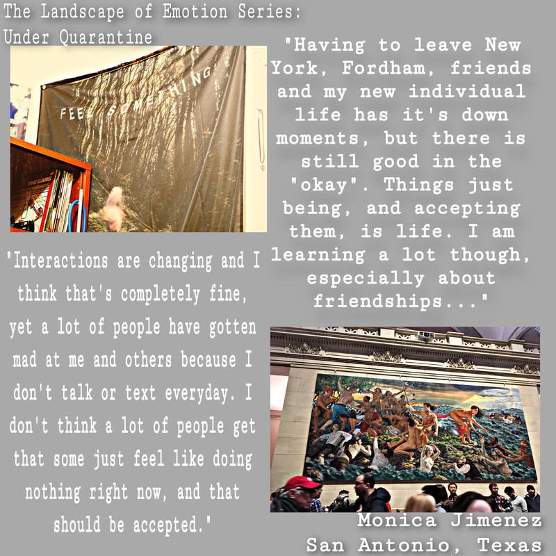 The Landscape of Emotion Series: Under Quarantine is a series illustrating the diverse experiences of mental health and feelings throughout quarantine. Monica Jimenez describes how her way of life was changed immediately after being told to return home.