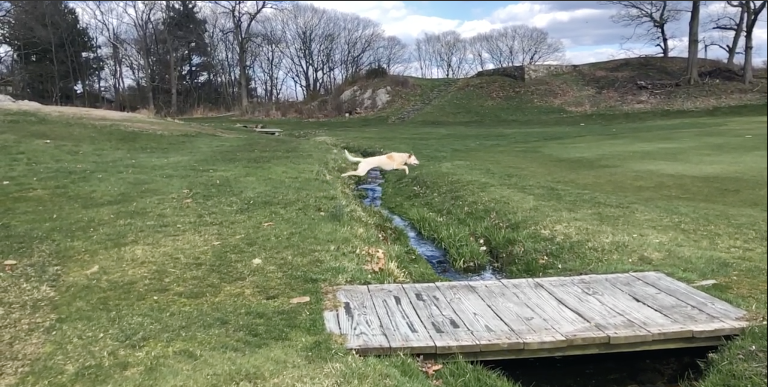 During the quarantine, open spaces are at a premium. I found this golf course in the Hyde Park neighborhood of Boston that was closed and nearly empty. I brought my dog there and she leapt over a stream on an uninhabited hole.