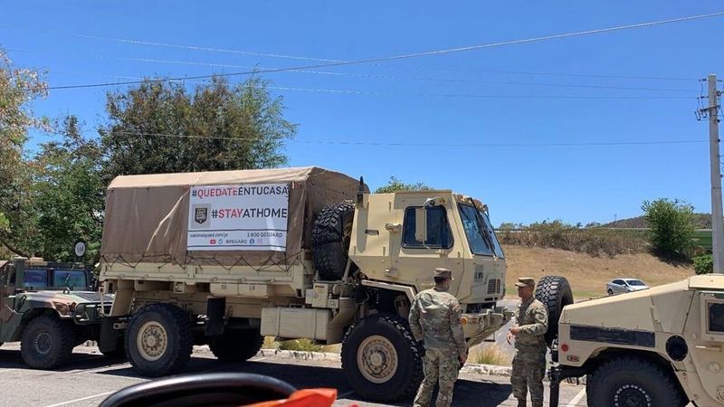 The National Guard drives around spreading the word to stay in your home or QUEDATE EN TU CASA!