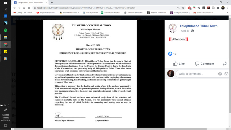 "EFFECTIVE IMMEDIATELY: Thlopthlocco Tribal Town has declared a State of Emergency for all Businesses and Tribal Operations. In compliance with Presidential declarations and guidance from the Centers for Disease Control due to the Pandemic of the Coronavirus, the governing body of Thlopthlocco Tribal Town shut down operations of all economic enterprises until further notice."
