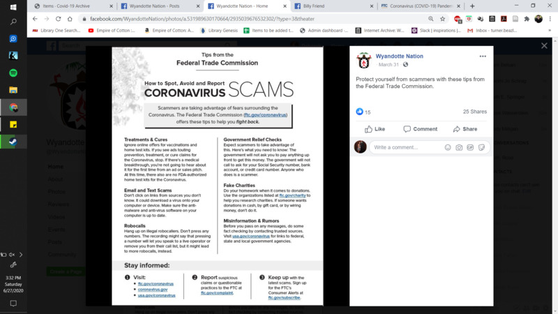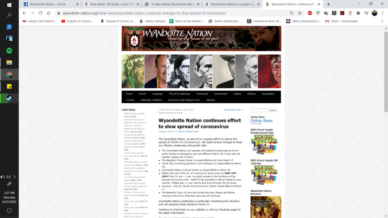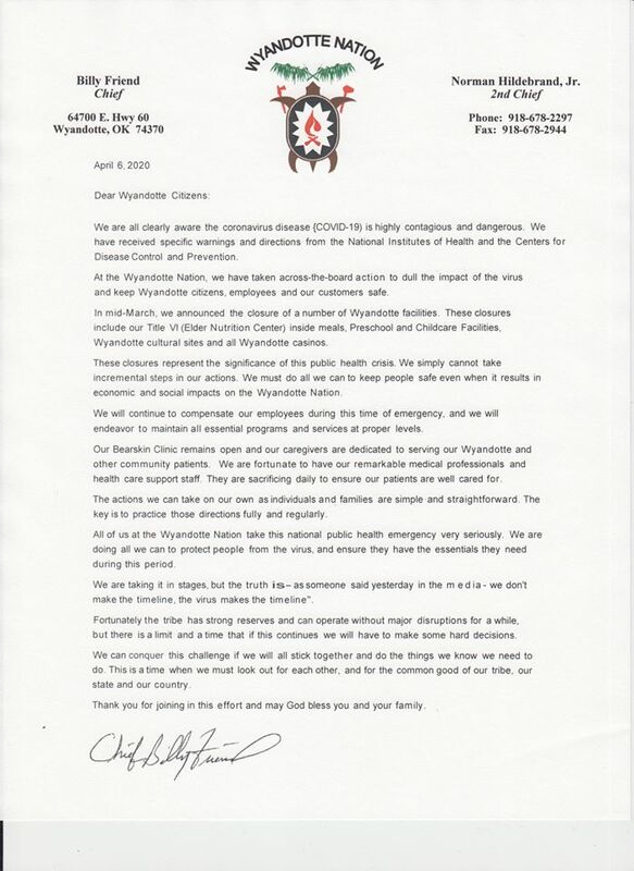 "At the Wyandotte Nation, we have taken across-the-board action to dull the impact of the virus and keep Wyandotte citizens, employees and our customers safe. In mid-March, we announced the closure of a number of Wyandotte facilities. These closures included our Title VI Program (Elder Nutrition Center) inside meals, Preschool and Childcare Facilities, Wyandotte cultural sites and all Wyandotte casinos."