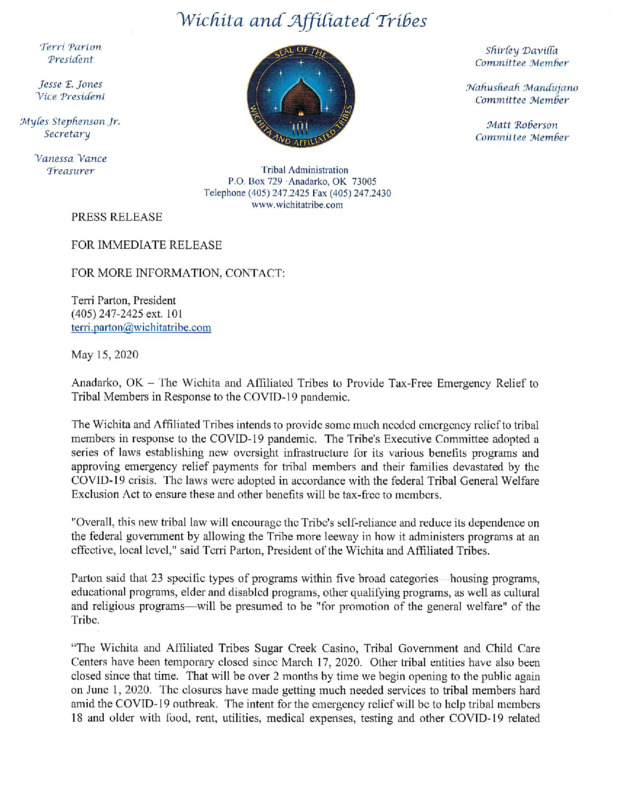 "The Wichita and Affiliated Tribes intends to provide some much needed emergency relief to tribal members in response to the COVID-19 pandemic. The Tribe's Executive Committee adopted a series of laws establishing new oversight infrastructure for its various benefits programs and approving emergency relief payments for tribal members and their families devastated by the COVID-19 crisis."