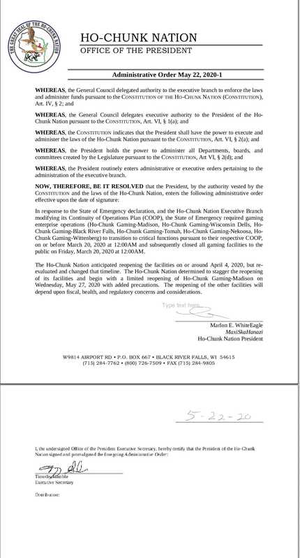 “The Ho-Chunk Nation anticipated reopening the facilities on or around April 4, 2020, but reevaluated and changed that timeline.”