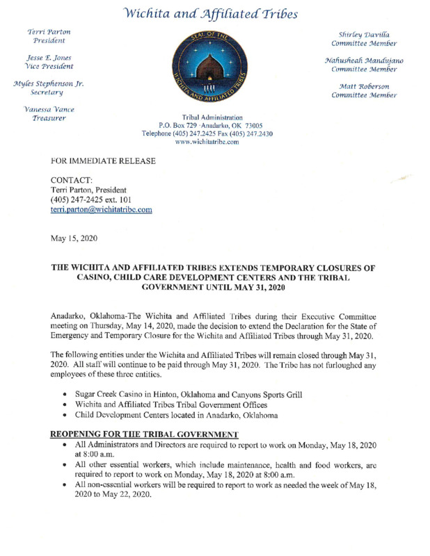 "Andarko, Oklahoma-The Wichita and Affiliated Tribes during their Executive Committee meeting on Thursday, May 14, 2020, made the decision to extend the Declaration for the State of Emergency and Temporary Closure for the Wichita and Affiliated Tribes through May 31, 2020."