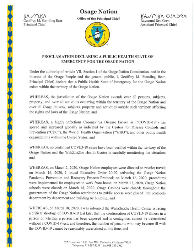 "Under the authority of Article VII, Section 1 of the Osage Nation Constitution, and in the intrest of the Osage People and the general public, I, Geoffrey M. Standing Bear, Principal Chief, declare that a Public Health State of Emergency for the Osage Nation exists within the territory of the Osage Nation."