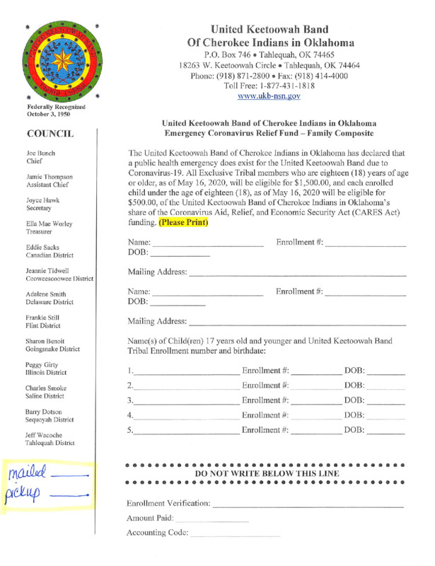 "The United Keetoowah Band of Cherokee Indians Tribal Council has declared a one-time, COVID-19 relief payment will be distributed to all enrolled, exclusive Keetoowah tribal members from the $24 million give to us through the CARES Act. Below are all the forms and steps required to complete the step by step guide to receiving funds."
