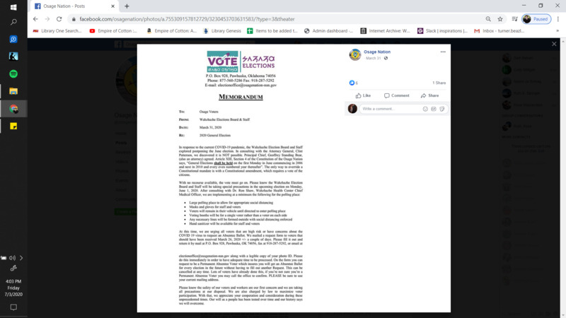 "In response to the current COVID-19 pandemic, the Wahzhazhe Election Board and Staff explored postponing the June election. In consulting with the Attorney General, Clint Patterson, we discovered it is NOT possible."