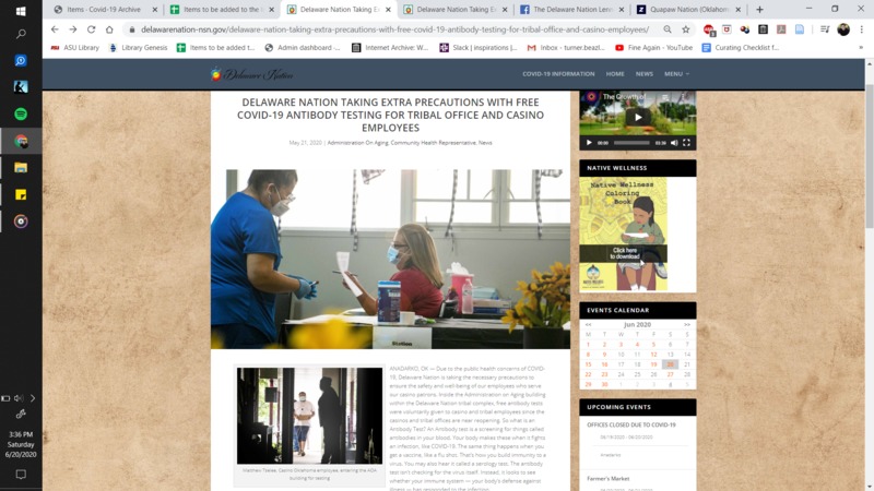 "Due to the public health concerns of COVID-19, Delaware Nation is taking the necessary precautions to ensure the safety and well-being of our employees who serve our casino patrons. Inside the Administration on Aging building within the Delaware Nation tribal complex, free antibody tests were voluntarily given to casino and tribal employees since the casinos and tribal offices are near reopening."