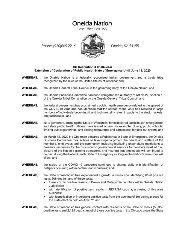 “March 12, 2020 the Chairman declared a Public Health State of Emergency, the Oneida Business Committee took actions to take steps to protect the health and welfare of the members, employees and the community, including instituting expenditure restrictions to preserve resources for the provision of governmental services to members most at risk, closure of the Nation’s gaming operations, and insuring that employees will continued to be paid during the Public Health State of Emergency as long as the Nation’s resources will allow.”