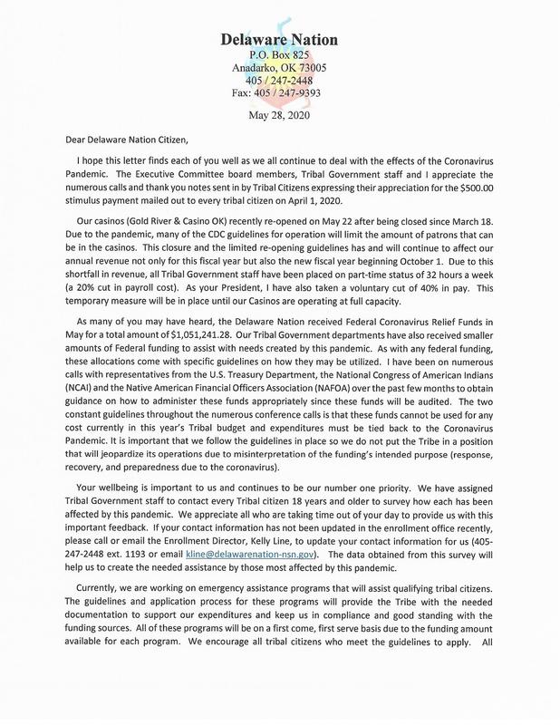 "Currently, we are working on emergency assistance programs that will assist qualifying tribal citizens. The guidelines and application process for these programs will provide the Tribe with the needed documentation to support our expenditures and keep us in compliance and good standing with the funding sources."