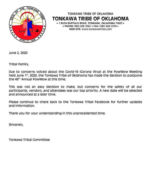 "Due to concerns voiced about the Covid-19 (Corona Virus) at the PowWow Meeting held June 1st, 2020, the Tonkawa Tribe of Oklahoma has made the decision to postpone the 46th Annual PowWow at this time."