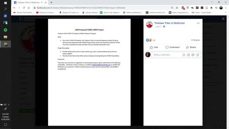 "Due to the COVID-19 Pandemic, the Tonkawa Tribe is in need of temporary shelter for those who have been diagnosed with COVID-19 (quarantine), those who have been tested for COVID-19 and are awaiting test results and those who are homeless during this event."