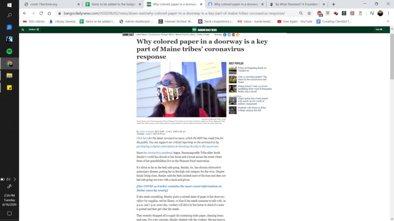 “Since the coronavirus pandemic began, Passamaquoddy Tribe elder Sarah Stanley’s world has shrunk to her home and a house across the street where three of her grandchildren live on the Pleasant Point reservation. It’s about as far as she feels safe going. Stanley, 60, has chronic obstructive pulmonary disease, putting her in the high-risk category for the virus. Despite family being close, Stanley said she feels isolated most of the time and does not feel safe going out even with a mask and gloves. If she needs something, Stanley posts a colored sheet of paper in her doorway: yellow for supplies, red for illness, or blue if she needs someone to talk with. At 9 a.m. and 7 p.m. every day, workers will drive by her home to check if a color is posted and they get what she needs.”
