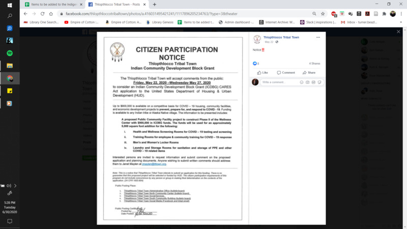 "The Thlopthlocco Tribal Town will accept comments from the public: Friday, May 22, 2020 —Wednesday May 27, 2020 to consider an Indian Community Development Block Grant (ICDBG) CARES Act application to the United States Department of Housing & Urban Development (HUD)."