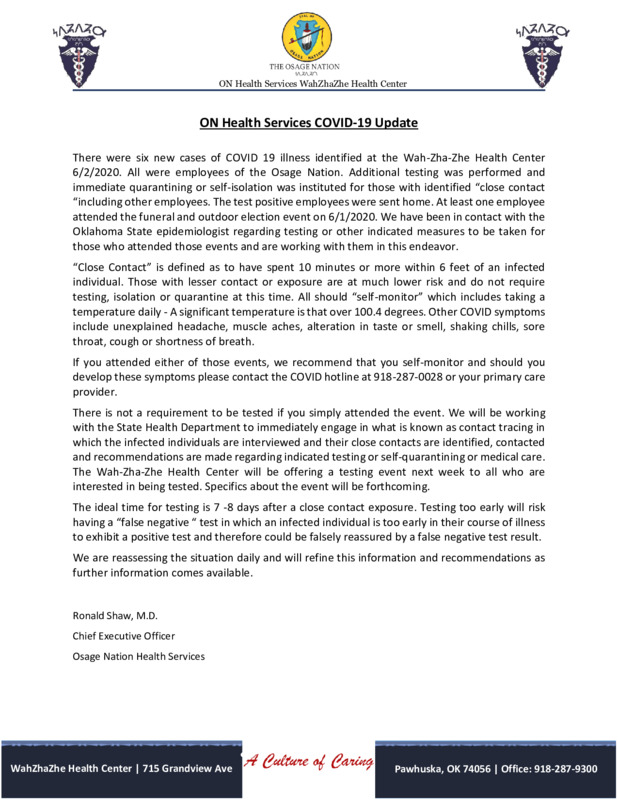 "There were six new cases of COVID 19 illness identified at the Wah-Zha-Zhe Health Center 6/2/2020. All were employees of the Osage Nation. Additional testing was performed and immediate quarantining or self-isolation was instituted for those with identified “close contact “including other employees. The test positive employees were sent home. At least one employee attended the funeral and outdoor election event on 6/1/2020. We have been in contact with the Oklahoma State epidemiologist regarding testing or other indicated measures to be taken for those who attended those events and are working with them in this endeavor."