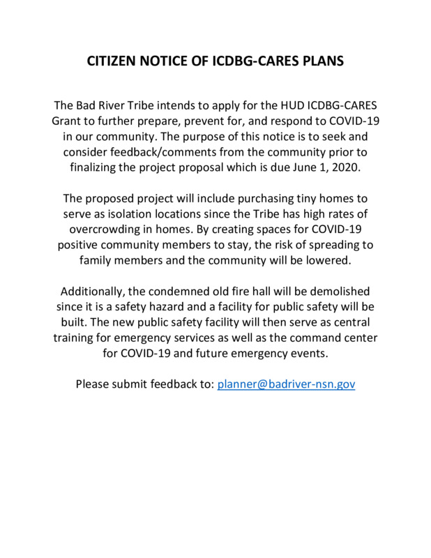 “The Bad River Tribe intends to apply for the HUD ICDBG-CARES Grant to further prepare, prevent for, and respond to COVID-19 in our community. The purpose of this notice is to seek and consider feedback/comments from the community prior to finalizing the project proposal which is due June 1, 2020. The proposed project will include purchasing tiny homes to serve as isolation locations since the Tribe has high rates of overcrowding in homes. By creating spaces for COVID-19 positive community members to stay, the risk of spreading to family members and the community will be lowered.” Geographic Location is Ashland, Wisconsin