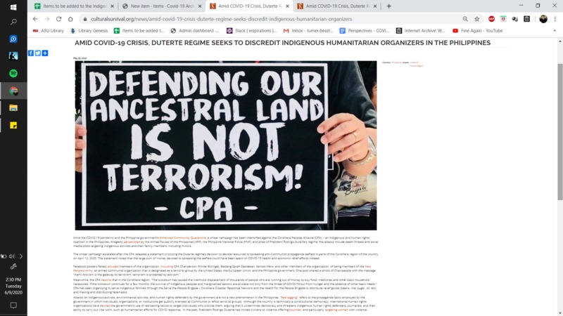 "These increased threats come at a time when Philippine President Rodrigo Duterte, on 1 April 2020, issued shoot-to-kill orders targeting individuals and organisations seen as ‘troublemakers’, a general term that includes ‘communists’, ‘leftists’ or anyone seen as opposing his rule, including Indigenous Peoples’ Human Rights Defenders."
