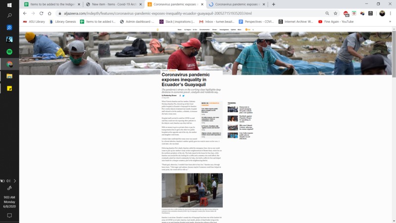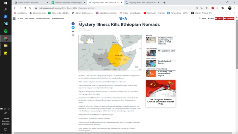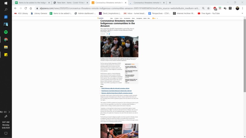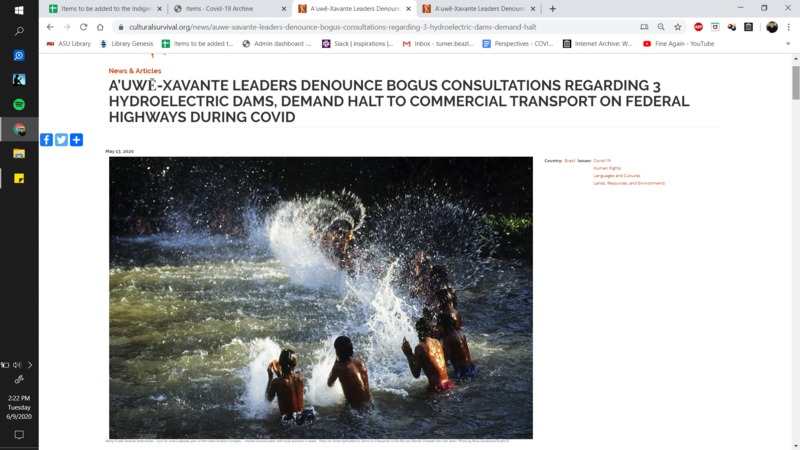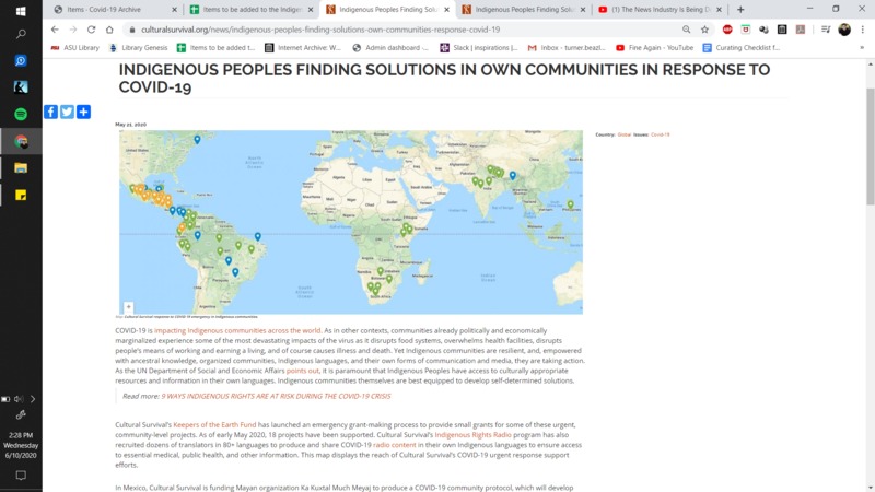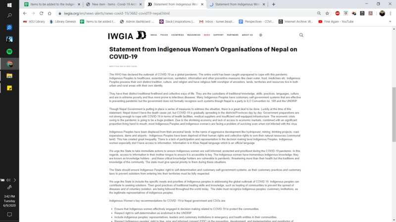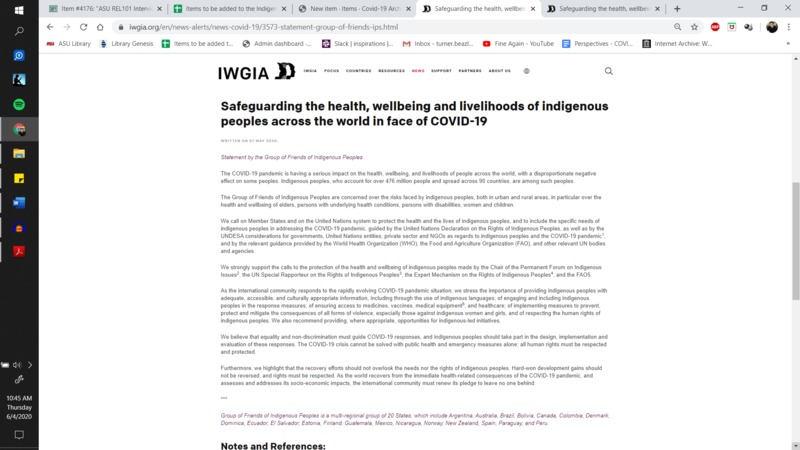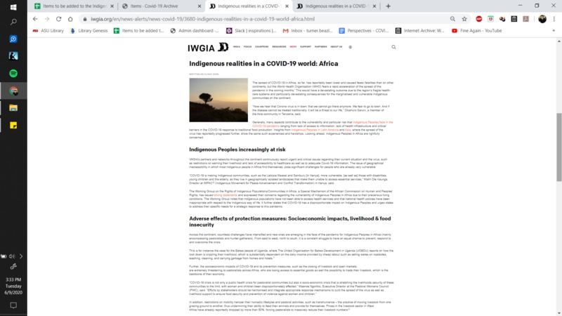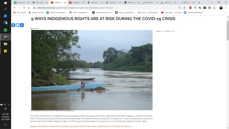 “The COVID-19 pandemic has highlighted and exacerbated existing inequalities and human rights abuses that affect Indigenous Peoples around the world. At the same time, governments are taking advantage of the attention that is directed to virus response in order to proceed with projects and policies that further violate Indigenous rights.” Examples provided include: deepening health disparities, lack of access to information, violence against Indigenous peoples takes advantage of global attention on COVID-19, extractive industries greenlighted to continue operations despite threats to health and safety, government responses to COVID-19 exacerbate bad policing, exacerbation of poverty, increased food insecurity, increased land grabs, and mistreatment of migrants.