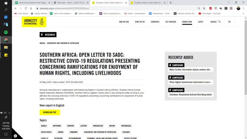 "Amnesty International in collaboration with Advancing Rights in Southern Africa (ARISA), Southern Africa Human Rights Defenders Network (SAHRDN), Southern Africa Litigation Centre (SALC) are writing this letter to bring to your attention the worrying restrictive COVID-19 regulations presenting concerning ramifications for enjoyment of human rights, including livelihoods. "