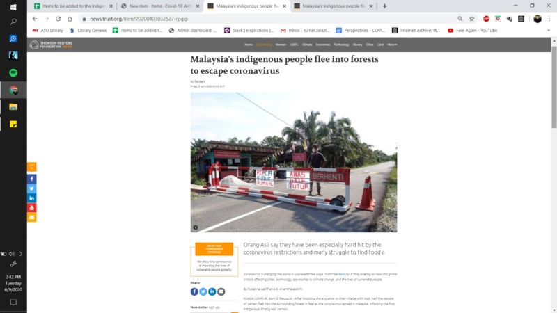 "After blocking the entrance to their village with logs, half the people of Jemeri fled into the surrounding forest in fear as the coronavirus spread in Malaysia, infecting the first indigenous 'Orang Asli' person."
