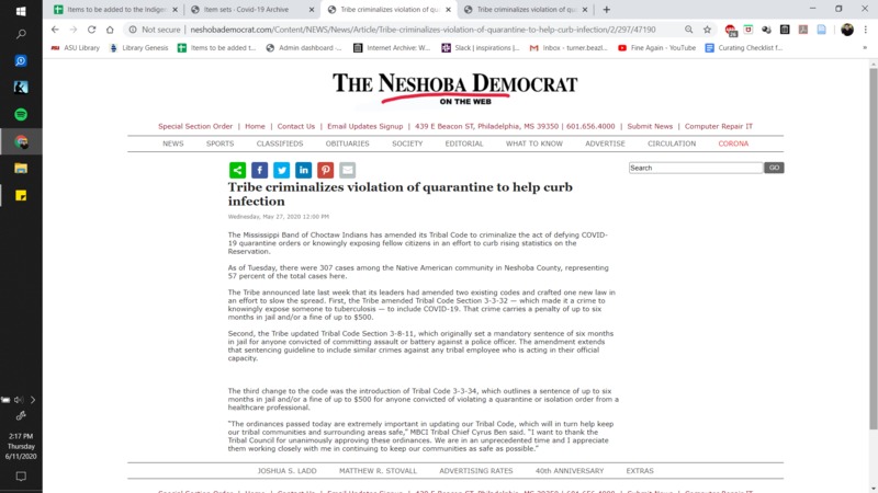 “The Mississippi Band of Choctaw Indians has amended its Tribal Code to criminalize the act of defying COVID-19 quarantine orders or knowingly exposing fellow citizens in an effort to curb rising statistics on the Reservation. As of Tuesday, there were 307 cases among the Native American community in Neshoba County, representing 57 percent of the total cases here. The Tribe announced late last week that its leaders had amended two existing codes and crafted one new law in an effort to slow the spread. First, the Tribe amended Tribal Code Section 3-3-32 — which made it a crime to knowingly expose someone to tuberculosis — to include COVID-19. That crime carries a penalty of up to six months in jail and/or a fine of up to $500.”