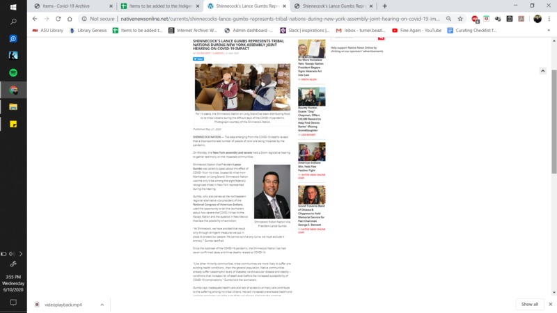 “On Monday, the New York assembly and senate held a Zoom legislative hearing to gather testimony on the impacted communities. Shinnecock Nation Vice President Lance Gumbs was called to speak about the effect of COVID-19 on his tribe, located 90 miles from Manhattan on Long Island. Shinnecock Nation was the only tribe among the eight federally recognized tribes in New York represented during the hearing…‘At Shinnecock, we have avoided that result only through stringent measures we put in place to protect our people. We cannot survive any curve, we must exclude it entirely,’ Gumbs testified.”