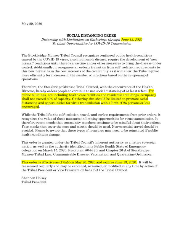 “The Stockbridge-Munsee Tribal Council recognizes continued public health conditions caused by the COVID-19 virus, a communicable disease, require the development of “new normal” conditions until there is a vaccine and/or other measures to bring the disease under control. Additionally, it recognizes an orderly transition from self-isolation requirements to this new normal is in the best interests of the community as it will allow the Tribe to pivot more efficiently for increases in the number of infections based on the re-opening of operations… This order is granted under the Tribal Council’s inherent authority as a native sovereign nation, as well as the authority identified in its Public Health State of Emergency delegation on March 15, 2020, Resolution #044-20, and Chapter 26-A of Stockbridge-Munsee Tribal Law, Communicable Disease, Vaccination, and Quarantine Ordinance.” Order expires June 13, 2020.