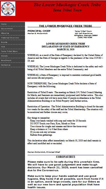 “Restriction of Tribal Events: The meeting on March 21st, Tribal Council Meeting for March, and Seminars are immediately postponed until further notice. This also includes all events that will have more than 10 people in attendance in the Tribal Administration Building or on Tribal Property until further notice. Restriction of Operation: The Tribal Administration Building is closed for the next two weeks for the safety of the staff and the Tribal Membership. The situation will be monitored and further closure may occur.”