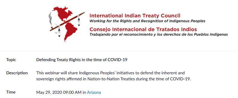 The International Indian Treaty Council hosts webinar on “Indigenous Peoples’ initiatives to defend the inherent and sovereign rights affirmed in Nation-to-Nation Treaties during the time of COVID-19.”