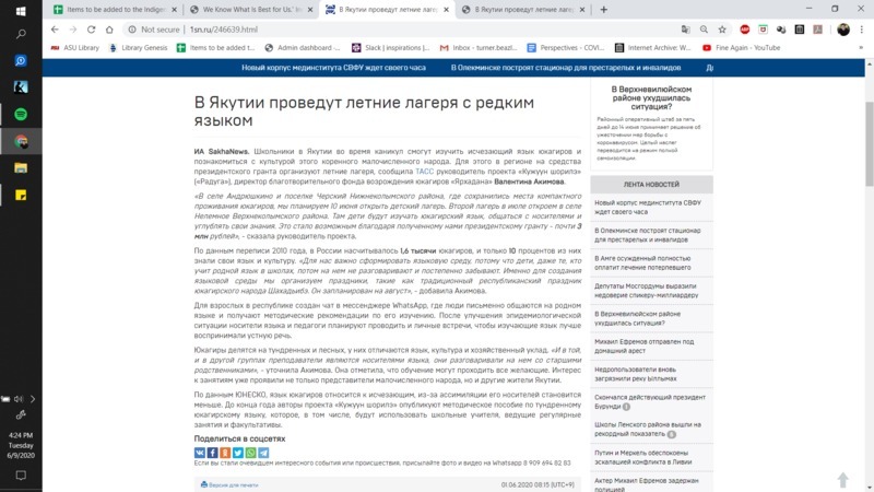 "Pupils in Yakutia during the holidays will be able to learn the endangered Yukaghir language and get acquainted with the culture of this indigenous small people. To do this, summer camps are organized in the region with presidential grant funds, Valentina Akimova , director of the Kuzhuun Shorile (Rainbow) project, director of the Yarkhag Yukagir revival fund"The European Court of Human Rights (ECHR) in Strasbourg registered a complaint of the so-called Yakut shaman Alexander Gabyshev , who disputes his detention on December 10, 2019 during a trip to Moscow"