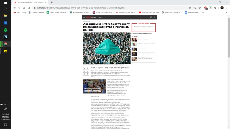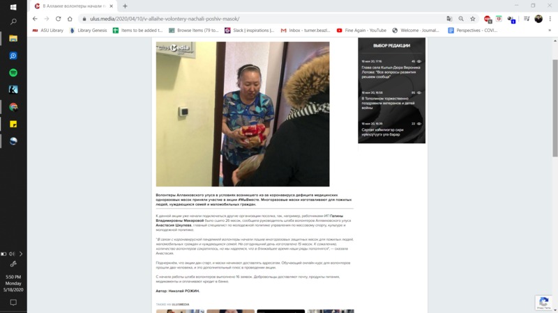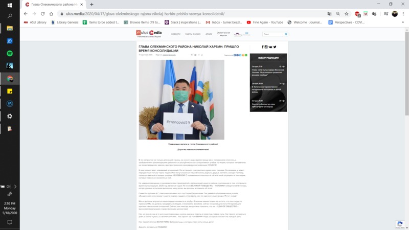“Over the past 24 hours, 4 new cases of coronavirus infection have been detected in the Khangalassky district . Over the entire period, COVID-19 was diagnosed in 8 people, according to the operational headquarters of the republic. New cases of coronavirus in the Khangalassky district are associated with an ophthalmic hospital. After the coronavirus was discovered in the clinic, a resident of the Khangalassky district, who had previously been treated in this clinic, was placed in the observatory….The headquarters has established over 100 contacts. Of these, 93 people were in contact with the first cases, 9 people - with a patient in an ophthalmological hospital….As the head of the district noted, among the contact persons there are also those who met with a resident of the city of Yakutsk, who later confirmed COVID-19. Despite the order of Rospotrebnadzor to observe the regime of self-isolation, the townspeople went to his relatives in the village of Ulakhan-An of the Khangalassky region for hunting, after which he returned to the capital of the republic. Here he was informed of the positive results of the analysis. Today, the local resident, with whom the sick man was hunting, is placed in the observatory, the remaining 4 people are on self-isolation at the place of residence.” #IndigenousStories