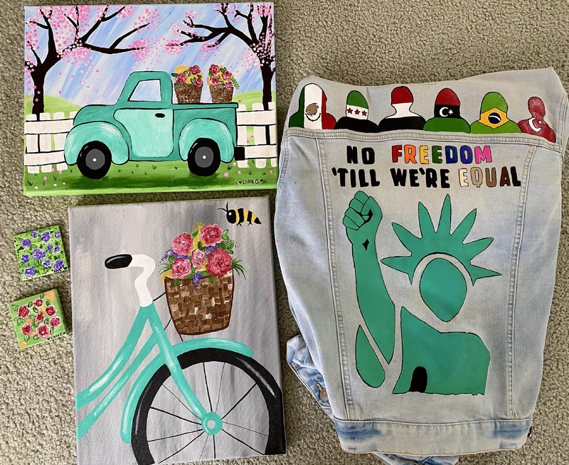 I am posting this photo because it showcases how I have spent a lot of my time during the pandemic. This photo displays every painting I have created since the beginning of quarantine. Some of the works shown in the picture are still works in progress and others are completed. Before Covid prevailed and we were sent home in the spring, I had lost interest in painting and had not painted in months. The lockdown that Covid brought on allowed me to slow down and rekindle the love and creativity I had for painting. In this photo, there are 14 paintings, however, I have made more and gave them to friends as gifts. I mainly work with acrylic paint on canvas because I like vibrant color and solid lines, although, I would like to start experimenting with oil paints soon. Covid-19 brought on many obstacles to a lot of people but I am grateful that I was allowed to reconnect with painting