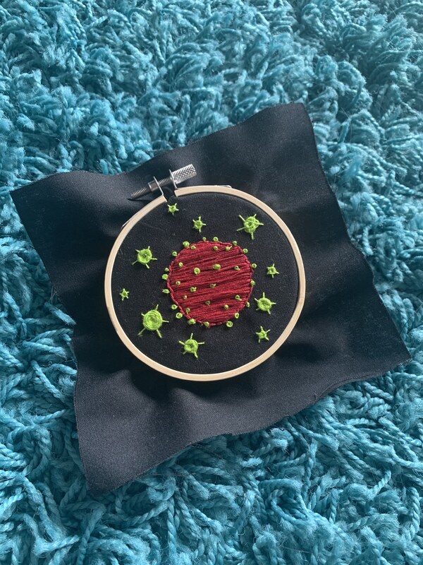 Every New Year, I make a promise to myself to try my hand at a new skill. In 2020 I was eager to learn how to embroider. Of course, only a few months into this year, we were slammed with the reality of Covid-19. Many of us felt depressed and isolated. I know that I was feeling especially guilty about all the extra time I had at home but felt no motivation to try and achieve goals that I had set earlier in the year. One day in April I was scrolling Reddit and came across an embroidery group. Suddenly it dawned on me that I had not even attempted to try my hand at embroidery! Lucky for me, I already had the supplies. I sat there a while wondering what to stich. Then the image, we all know so well by now, of the Coronavirus molecule popped up on the Nightly News. I knew that would be my pattern for my first ever attempt at needlepoint. It quickly became a small project that I am very proud of and it is my little souvenir from this crazy year.