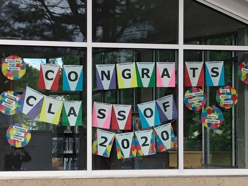 The image above shows the window of the Peaks Island Library, where the town celebrated their graduating seniors with a “Congrats class of 2020” sign. Surrounding the banner are the names of the high schools the students attended. Since the shutdown began just months before my class was set to graduate people all over the state have been putting up signs and decorations to give us a celebration. We had virtual commencement speeches, videos, lawn signs, balloons, and free pizzas that in a way made the year more special than a normal walk across the stage.