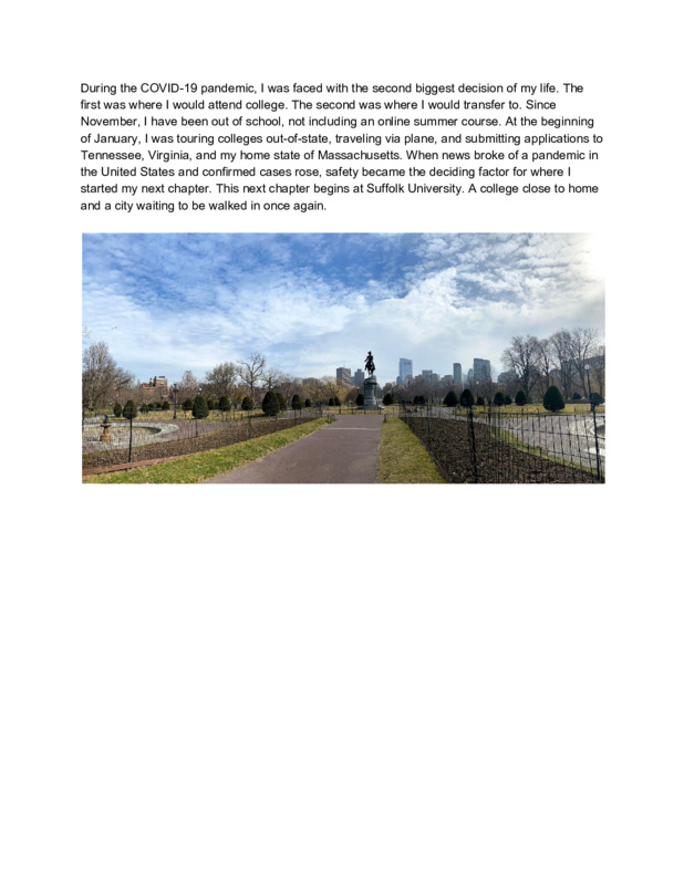 While the covid-19 pandemic continues to bring many struggles and create new challenges for people all over the world, I still believe that I will be able to thrive in college, and that the new challenges brought on by covid-19 pandemic will be met by creative solutions. I plan to continue to strive as a student and as a member of the Suffolk community, and to embrace the new social distancing norm.