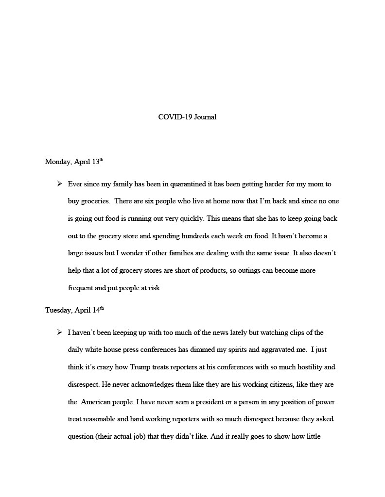 COVID 19 Journal by Kaitlin Whalen written 03/24/2020-04/24/2020. -