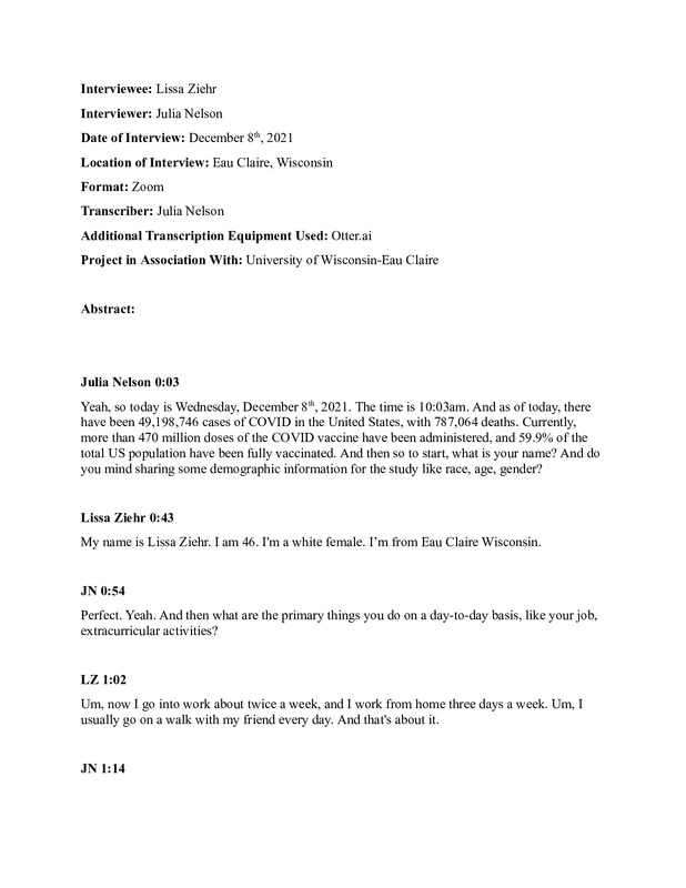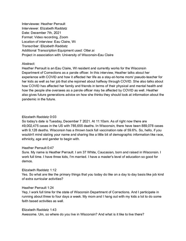 Heather Perrault is an Eau Claire, WI resident and currently works for the Wisconsin Department of Corrections as a parole officer. In this interview, Heather talks about her experience with COVID and how it affected her life as a stay-at-home mom/ pseudo-teacher for her kids as well as her job that she rejoined about halfway through COVID. She also talks about how COVID has affected her family and friends in terms of their physical and mental health and how the people she oversees as a parole officer may be affected by COVID as well. Heather also gives future generations advice on how she thinks they should look at information about the pandemic in the future.