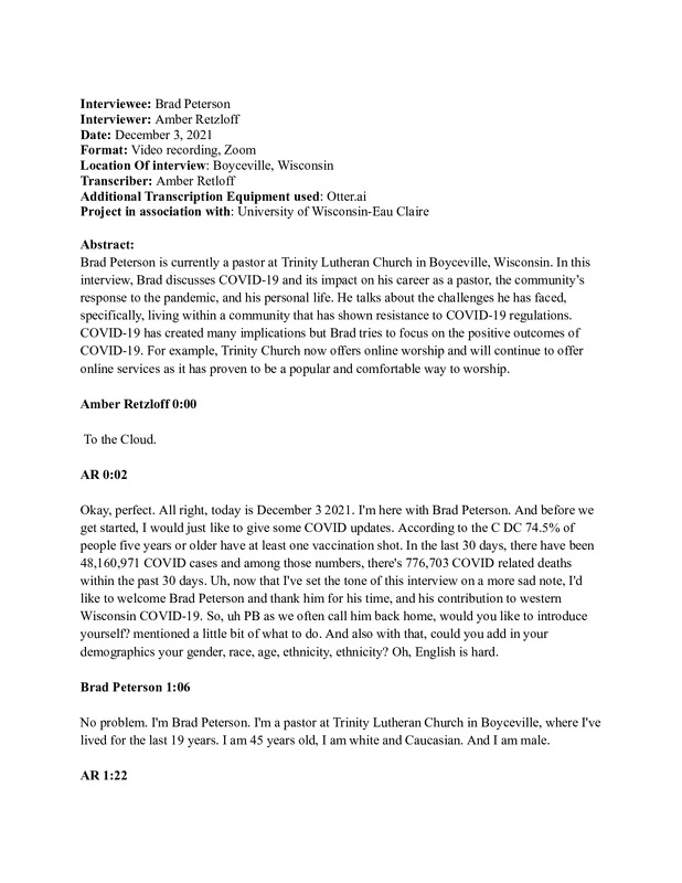 Brad Peterson is currently a pastor at Trinity Lutheran Church in Boyceville, Wisconsin. In this interview, Brad discusses COVID-19 and its impact on his career as a pastor, the community’s response to the pandemic, and his personal life. He talks about the challenges he has faced, specifically, living within a community that has shown resistance to COVID-19 regulations. COVID-19 has created many implications but Brad tries to focus on the positive outcomes of COVID-19. For example, Trinity Church now offers online worship and will continue to offer online services as it has proven to be a popular and comfortable way to worship.