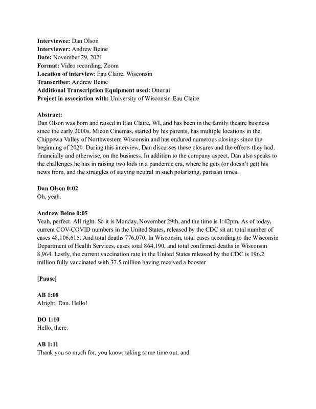Dan Olson was born and raised in Eau Claire, WI, and has been in the family theatre business since the early 2000s. Micon Cinemas, started by his parents, has multiple locations in the Chippewa Valley of Northwestern Wisconsin and has endured numerous closings since the beginning of 2020. During this interview, Dan discusses those closures and the effects they had, financially and otherwise, on the business. In addition to the company aspect, Dan also speaks to the challenges he has in raising two kids in a pandemic era, where he gets (or doesn’t get) his news from, and the struggles of staying neutral in such polarizing, partisan times.