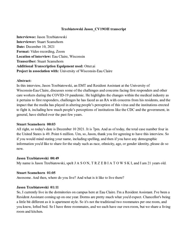 In this interview, Jason Trzebiatowski, an EMT and Resident Assistant at the University of Wisconsin-Eau Claire, discusses some of the challenges and concerns facing first responders and other care workers during the COVID-19 pandemic. He highlights the changes within the medical industry as it pertains to first responders, challenges he has faced as an RA with concerns from his residents, and the impact that the media has played in altering people’s perception of this virus and the institutions erected to fight it, including how much people’s perceptions of institutions like the CDC and the government, in general, have shifted over the past few years.